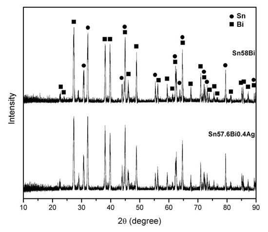 X-ray diffraction (XRD) patterns of Sn58Bi and Sn57.6Bi0.4Ag.