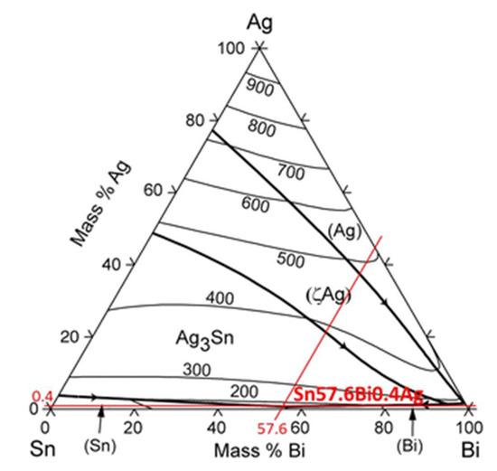 Sn57.6Bi0.4Ag showed slightly more refined microstructure than Sn58Bi, and this was attributed to microalloying of Ag. In the microstructure of Sn57.6Bi0.4Ag, an extra rod-like phase could be observed, as shown in Figure 6. According to the phase diagram of Sn–Bi–Ag, as shown in Figure 7, this phase was confirmed to be Ag3Sn IMCs precipitated from the Sn matrix. However, an Ag3Sn phase was not detected in XRD, presumably due to its limited content.