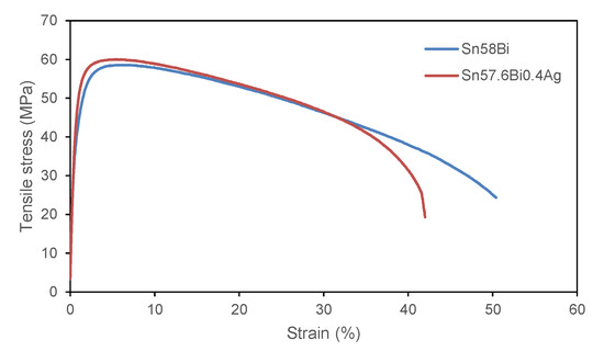 Figure 8 shows the typical tensile stress–strain curves of Sn58Bi-based solder alloys. UTS, YS (represented by 0.2% proof stress), elongation, Young’s modulus, and microhardness of each alloy are listed in Table 1 as well as presented in Figure 9. It can be clearly observed that UTS, YS, and Young’s modulus of Sn58Bi-based solder alloy were all slightly increased by microalloying 0.4 wt.% Ag. UTS of Sn57.6Bi0.4Ag alloy was 58.7 MPa, which was 6.7% higher than that of Sn37Pb eutectic alloy (55 MPa) [39] and 2.6% higher than that of Sn58Bi (57.2 MPa). It is worth noting that the YS of Sn58Bi solder alloy was improved by 1.8%, to 46 MPa, with the addition of 0.4 wt.% Ag. Also, the Young’s modulus was raised by 14.7% as compared with Sn58Bi. While the tensile strength increased, the Ag microalloy had a negligible effect on the microhardness of Sn58Bi. The elongation, however, was decreased by 10.6% with Ag addition, compared with that of original Sn58Bi.