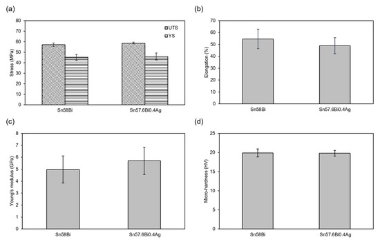 The comparison of mechanical properties: (a) UTS and YS, (b) elongation, (c) Young’s modulus, and (d) microhardness, for Sn58Bi and Sn57.6Bi0.4Ag solder alloys.