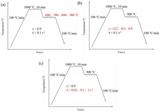 Schematic illustration of the different process parameters: (a) the different deformation temperatures, (b) the different deformation reductions, (c) the different deformation rates.