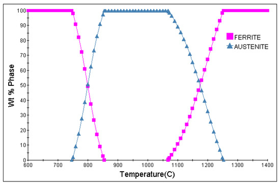 The equilibrium phase diagram of the employed low-carbon ferritic stainless steel calculated by JMatPro software.