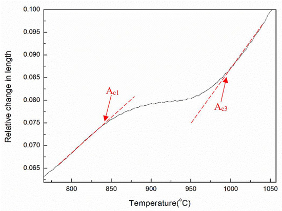 As mentioned above, the original sample is in an as-rolled state, so the isothermal treatment at high temperature (annealing or normalizing) is necessary before deformation to remove the deformation texture and the residual stress caused by rolling. Figure 3 shows the equilibrium phase diagram of the employed low-carbon ferritic stainless steel calculated by JMatPro 7.0 software (Sente Software, Guildford, UK). It is found that, in the temperature range from 854 to 1068 °C, the steel is in the single-phase austenite region. Figure 4 gives the proof for the occurrence of austenitic transformation during heating with a rate of 100 °C/min. It can be seen that the inflection points resulted from austenitic transformation on the thermal expansion curve captured by Gleeble-3500. The Ac1 and Ac3 points can be determined as 837 and 991 °C. The transformation temperatures were determined from the dilatometer curves using the tangent line method [14].