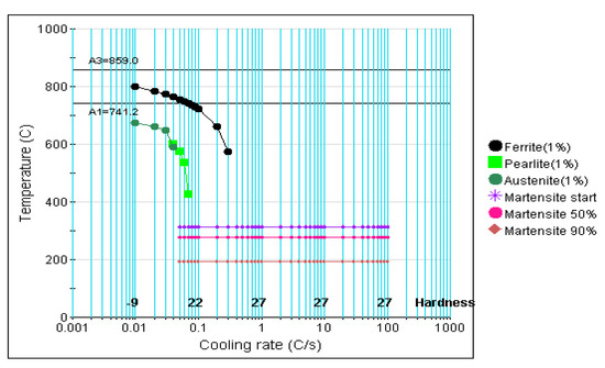 Continuous cooling transformation (CCT) diagram of the explored low-carbon ferritic stainless steel in this work calculated by JMatPro software.