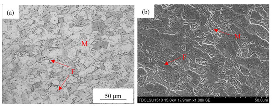 Figure 5 gives a continuous cooling transformation (CCT) diagram for the explored low-carbon ferritic stainless steel in this work, calculated by JMatPro software. It is found from Figure 5 that martensitic transformation occurs under the cooling rate between 3 °C/min (0.05 °C/s) and 6000 °C/min (100 °C/s). When the cooling rate is higher than 18 °C/min (0.3 °C/s), the ferritic transformation would not happen, and the austenite would be decomposed to martensite completely. According to the experimental CCT diagram for 3Cr12 steel [15], a typical low-carbon 12% Cr ferritic stainless steel, martensitic transformation still occurs when the cooling rate is as low as 0.084 °C/min. Figure 6 presents the microstructure of the low-carbon ferritic stainless steel sample after austenitization, whose treatment parameter is heating to 1000 °C with a heating rate of 100 °C/min, holding for 10 min, and cooling to room temperature with a cooling rate of 100 °C/min. Due to the moderate cooling rate after austenitization (air cooling), the bainitic and pearlite transformation would be avoided, and only martensite would form during cooling. As a result, it can be confirmed that the microstructure of the sample is composed of martensite (denoted as “M” in Figure 6), and δ-ferrite distributed along the prior austenitic boundaries (denoted as “F” in Figure 6).