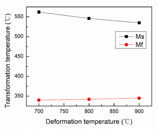 Figure 8 shows the phase transformation temperatures, determined by Gleeble-3500, for the low-carbon ferritic stainless steel samples deformed at the different temperatures. It can be confirmed as martensitic transformation, in consideration of the low transformation temperature. With the increase in deformation temperature, the starting temperature for martensite transformation, Ms, is decreased, while the martensitic transformation finishing point remains almost unchanged, regardless of the deformation temperature. Besides, the Ms of the samples after deformation is higher than that of the samples without deformation (determined as 528 °C). This is because a large number of dislocations and other defects form during the deformation process, which provides more nucleation sites for martensitic transformation, and thus promotes martensitic transformation [17]. The higher the deformation temperature is, the more favorable the dynamic recovery of defects is. Hence, the number density of the defects is decreased accordingly, which results in a lower Ms in the sample with the higher deformation temperature.