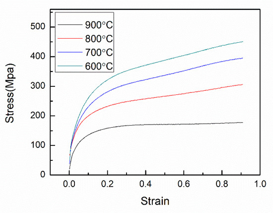 The stress–strain curves of the samples with the different deformation temperatures are presented in Figure 9. A decrease in deformation temperature leads to an increase in loading stress for reaching the same strain amount, since the yield strength of the steel is decreased by the increase in temperature. The stress–strain curves of the samples with the deformation temperatures of 600, 700 and 800 °C are monotonically increased, showing the typical characteristic of work hardening. On the other hand, in the sample deformed at 900 °C, when the strain is more than 0.3, the stress–strain curve is horizontal, representing the dynamic softening process [20]. Firstly, during deformation at high temperature, dynamic recovery and recrystallization occurs, offsetting the work hardening effect resulting from dislocation multiplication [21,22]. Secondly, according to the microstructural observation, the higher deformation temperature promotes the DSIT ferrite formation, accompanied by the movement and annihilation of dislocation, which also results in the loss of work hardening effect [19].