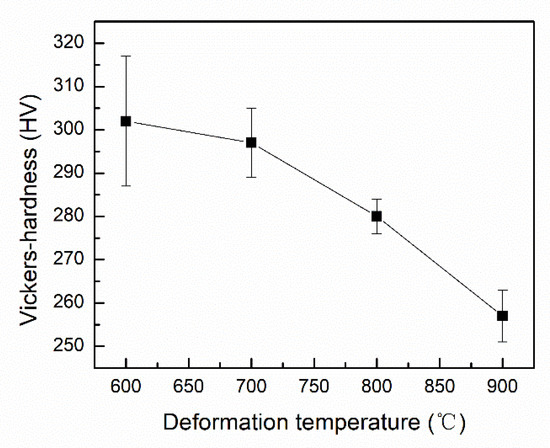 Figure 10 shows the values for Vickers hardness of the samples deformed at the different temperatures. It can be seen that the results of the hardness tests agree with the stress–strain curves. With the increase in deformation temperature, the hardness is decreased. This is mainly due to the fact that the rate of dynamic recovery and recrystallization will be faster when the sample is deformed at the higher temperature, which offsets the effect of work hardening. The difference in the phase ratio of martensite to ferrite may also affect the hardness results. The size of the DSIT ferrite is higher up to about 5 μm in this project, so the hardness of ferrite would be lower than that of lath martensite [23]. As mentioned above, the lower deformation temperature is more favorable to the formation of martensite, leading to the relatively high hardness. Besides, the residual stress remains at the lower deformation temperature, which may also lead to an increase in hardness.
