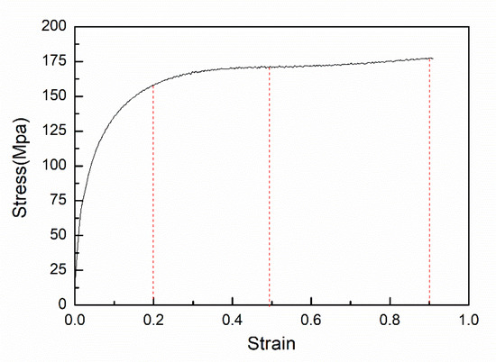 The true stress–strain curves for the low-carbon ferritic stainless steel samples with a deformation reduction of 0.9.