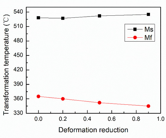 Figure 13 presents the martensitic starting and finishing temperatures for the samples with the different deformation reductions. It is found that the Ms points are not significantly affected by the deformation reduction, but only slightly increased. Due to the high deformation temperature, the occurrence of recovery during cooling after deformation decreases the defect density, resulting in the decrease in nucleation sites for martensitic transformation accordingly. However, the Mf points are brought down by the increase in deformation reduction. This may be due to the fact that the movement of austenite/martensite phase boundaries is hindered during martensitic transformation. The martensitic transformation mechanism belongs to the non-diffusion type, with the shear-controlled phase transformation characteristics [24]. The yield strength of the parent phase (namely austenite) is improved by the increase in deformation reduction, impeding the migration of the martensite/austenite interface. Thus, the rate of martensitic transformation is decreased, reflected as the decrease in Mf points.