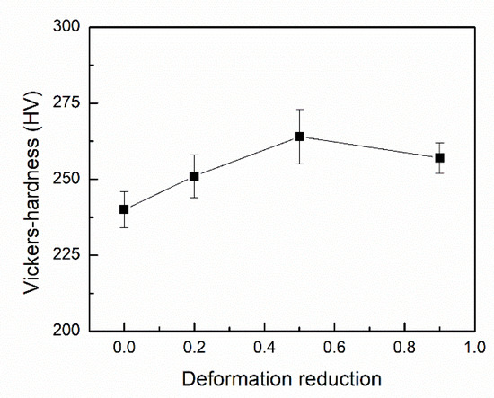 Vickers hardness of the low-carbon ferritic stainless steel samples with the different deformation reductions.