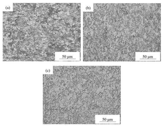 Optical micrographs of the low-carbon ferritic stainless steel samples with the different strain rates: (a) 0.01 s−1, (b) 0.1 s−1, (c) 1 s−1.