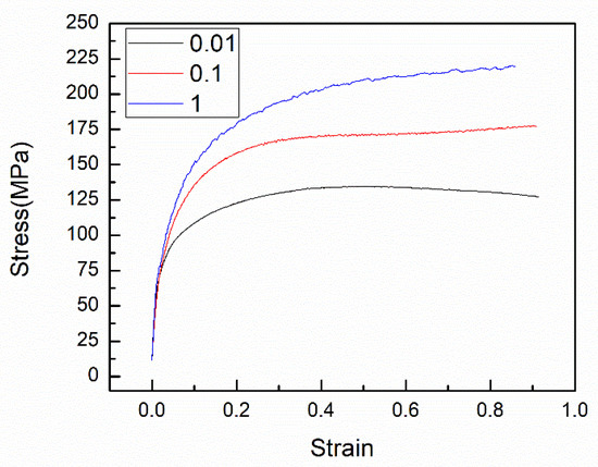 The stress–strain curves for the different strain rates are shown in Figure 16. The stress–strain curve shows a more obvious softening with the decrease in the strain rate. The stress–strain curve of the sample undergoing the highest deformation rate (1 s−1) reflects the typical work hardening characteristics. When the strain rate is the slowest (0.01 s−1), the phase fraction of ferrite is the lowest. Thus, it is considered that the main origin of the softening phenomenon would be the dynamic recovery of dislocations, and the dynamic recrystallization of a small amount of ferrite grains.