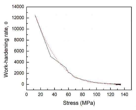 According to [25], the critical stress for recrystallization, σc, can be determined in the curves for the work-hardening rate, θ, versus flow stress, σ, where θ is expressed as dσ/dε. As seen in Figure 17, the value for σc is associated with the point at which the second derivative of the work-hardening rate θ with respect to stress, i.e., d2θ/dσ2, is zero. The simplest equation for fitting the θ-σ curve can be given by [26]: