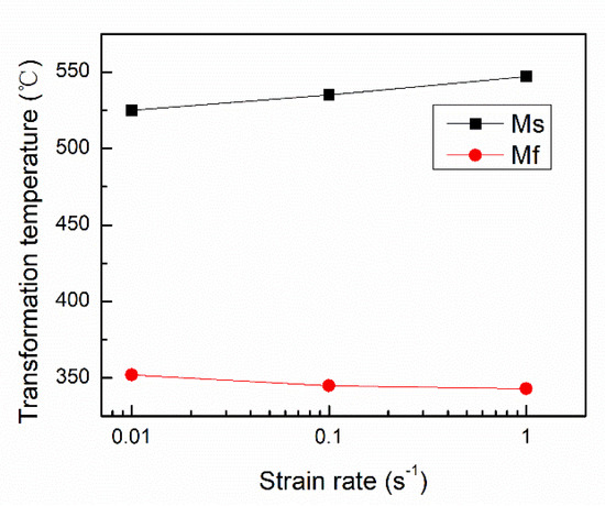 The martensitic starting and finishing temperatures for the samples with the different deformation rates are presented in Figure 18. It is found that an increase in the strain rate results in an increase in Ms. Under the condition of high strain rate, the high density of dislocation remains and provides more nucleation sites for the subsequent martensitic transformation, reflected as the increase in martensitic starting transformation temperature. Furthermore, the higher deformation rate results in a higher yield strength of the metastable austenite, which would hinder the movement of austenite/martensite boundaries during martensite. Hence, the increase in the deformation rate results in the decrease in the martensitic transformation rate, and thus the decrease in Mf.
