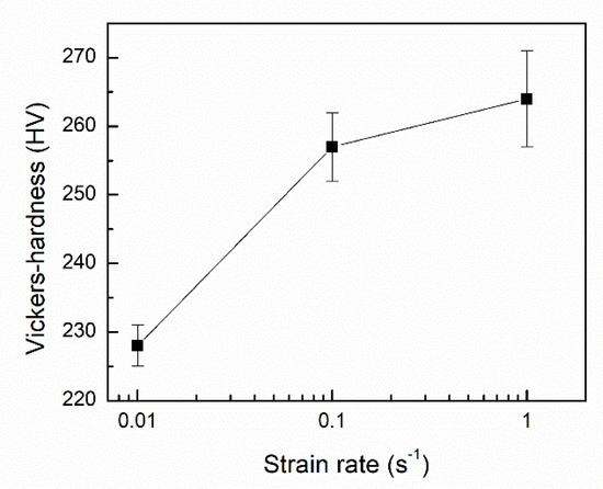 Figure 19 shows the Vickers hardness of the samples with the different strain rates. With the increase in the strain rate, the hardness increases monotonically. This is attributed to the fact that the microstructure has sufficient time for recovery and recrystallization under the condition of slow strain rate, which leads to the reduction of hardness.