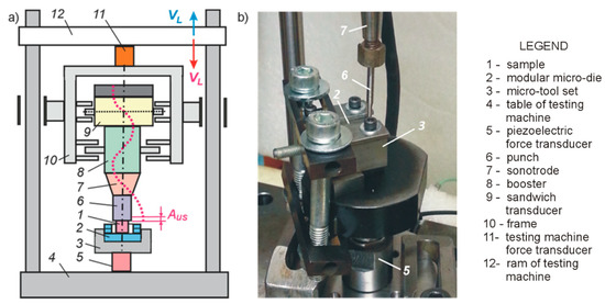The sample 1 is placed in the modular micro-die (2) in the Micro-tool set (3) standing on the force transducer (5) fixed on the table (4) of the testing machine. The sample is deformed using the punch (6), which is at the end of the sonotrode (7) of the ultrasonic system (8—booster, 9—sandwich transducer). This system is mounted in the frame (10), which through the force transducer (11) is connected to the ram (12) of the testing machine. An alternating voltage oscillating at ultrasonic frequency is applied by a power supply unit to the piezoelectric transducer. Booster and sonotrode work as half-wavelength resonators, vibrating lengthwise with standing waves at its resonant frequency. The frequency used is 20 kHz. Sonotrode acts as a displacement amplifier. On the basis of the laser displacement transducer, Keyence LK-H008, (Keyence, Osaka, Japan), the amplitude AUS of the ultrasonic vibrations on the surface of the booster and the face of the punch was determined, see Table 1.