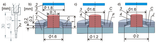 Tools included in the test are shown in Figure 2. The micro-die used in the research has a modular structure. It consists of plates with precision holes drilled with the EDM, which can be combined in various configurations. Three versions of it were used, as shown in Figure 2: 0.2-mm thick plates designated as: C, F, and J were used. In each of presented experiments, two modules were used, matching them as follows: CC, FC, JC.