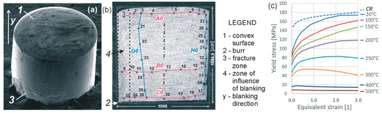 The deformation In UOM process starts at its periphery that is rolling on the surface of the bottom of the die and the face of the punch (Figure 12a,b). In the upper and lower parts of the samples, achieved ranges of deformations are impossible to be obtained in the process of free upsetting of this material [38]. Figure 12c shows the similar sample to these used in this work after the ultrasonic assisted upsetting process—the sample has cracked under deformation of the equivalent strain about 0.3. Achieving much larger deformations in the UOM process is associated with an increase in temperature resulting in increased deformability of the material.