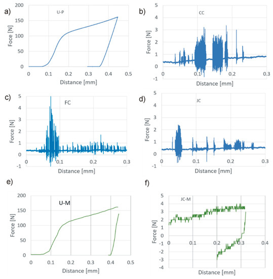 During the processes, forces were recorded using a strain gauge dynamometer of a testing machine, Figures 1–11 and an additional piezoelectric dynamometer, Figures 1–5. The recorded runs of process forces are shown in Figure 4.