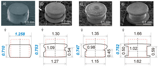 In Figure 5 are reported images and outlines of the samples after upsetting and UOM. The outlines were obtained on the basis of microscopic photographs taken from the side.