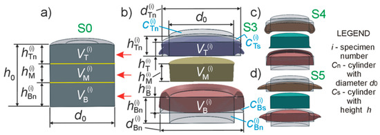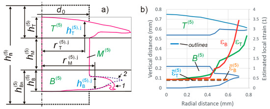 The methodology for determining the average equivalent strain in deformed areas is shown in Figure 7a–d. At the beginning, the values h(i)T,M,B, i = 3, 4, 5 (top, middle, bottom) were determined and the half-section boundary was determined for each of the samples. Assuming the symmetry of shapes, 3D axially symmetric models of each of the specimens were prepared. Then the models were divided into three parts according to the determined h(i)T,M,B and their volumes V(i)T,M,B were calculated as well as the dimensions of cylinders c(i)T,B,n and c(i)T,B,s. Assuming that their volumes are equal to the volumes V(i)T,M and their dimensions meet (2) and (3) respectively, the values h(i)T,M,B,n and d(i)T,M,B,n were calculated according to (4) and (5).