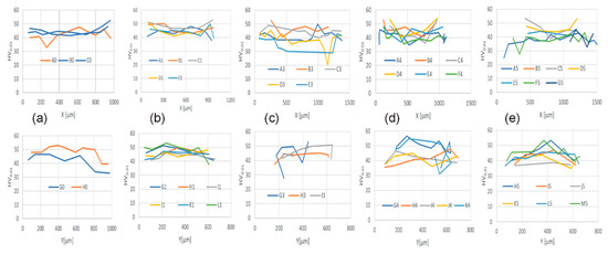 The results of micro-hardness measurements at the points marked in Figure 9 and in accordance with the courses of marked lines: (a) S0; (b) S1; (c) S3; (d) S4; (e) S5.