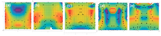 Micro-hardness distribution: (a) S0; (b) S1; (c) S3; (d) S4; and (e) S5.