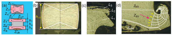 The UOM process creates a specific structure of the deformed sample. In the "classic" free upsetting, Figure 13a there are four zones: Z1 and Z2—the material is virtually unstrained; Z3—slight deformation and Z4—intense flow. These areas can be reflected in the microhardness distribution, Figure 11b. However, it should be remembered that the sample before deformation had the material structure after cold rolling, which was further changed in the blanking process.