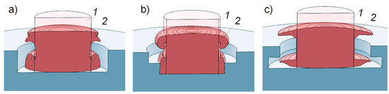 The probably presence of hydrostatic pressure in the bottom part of specimen results in the reduction of ZUT and ZUB zones by evolution of interface surfaces—white lines m and r in Figure 6b has been evolved into red lines n and s. In other cases, as shown in Figure 15 the final outline of the sample is different from the outline of the cavity of the die.