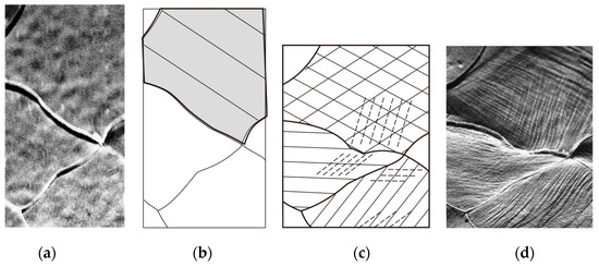Plastic behavior is observed by means of slip traces (Figure 1d) in all grains during deformation. If any of the RSs acting on a concerned grain reaches its upper limit, as shown in Equation (4), certain slip systems in the neighboring grains may be additionally activated on the boundary area in addition to the normal penetrating slips. In this case, the stress and strain equilibria cannot be maintained elastically as discussed above but also by the local plastic behavior around the boundary areas, as induced by several nonpenetrating slips (Figure 1c, indicated by parallel dashed lines) on which shear stress has reached the critical value for activation. The nonpenetrating characteristics of the slips imply that stress and plastic strain in equilibrium run fluctuant from one grain over the boundary to another grain (Figure 1d) and cannot be similar to that predicted by the Taylor principles.