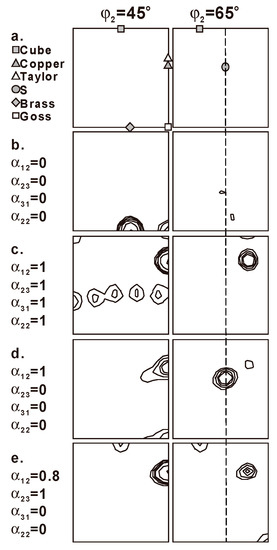 Relationship between the effective coefficient αij and stabilities of the main rolling texture components in aluminum at 95% rolling reduction simulated by the RS model based on 936 initial random orientations [17]. (ε33 = −3.0, i.e., 95% reduction; simulation steps Δε33 = 0.001; orientation distribution functions (ODF) φ2 = 45° and φ2 = 65° sections; density levels: 5, 10, 20, 40, 80 and 160). (a) Orientation position of texture components; (b) stable brass and Goss textures at α12 = α23 = α31 = α22 = 0; (c) stable Taylor texture at α12 = α23 = α31 = α22 = 1; (d) stable S texture at α12 = 1 and α23 = α31 = α22 = 0; (e) stable copper and cube textures at α12 = 0.8, α23 = 1 and α31 = α22 = 0.