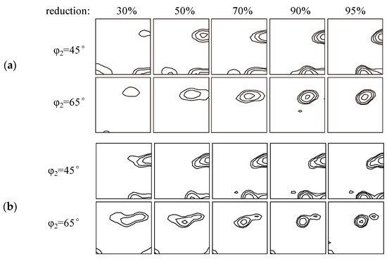 An aluminum ingot with commercial purity (99.9% Al) was forged in three directions with reducing forging reductions (25%, 15%, 10% and 5%), followed by annealing at 500 °C for 10 min [16]. Then, a sample with 8.6 mm thickness and a random initial texture was cut. The sample was cold-rolled down to reductions of 30%, 50%, 70%, 90% and 95%, while the true strain ε33 reached −0.36, −0.7, −1.2, −2.1 and −3.0, respectively. Figure 3a provides the rolling textures in ODF sections, in which the evolution of copper and brass textures in the φ2 = 45° section and the S texture in theφ2 = 65° section (Figure 2a) during rolling can be observed.