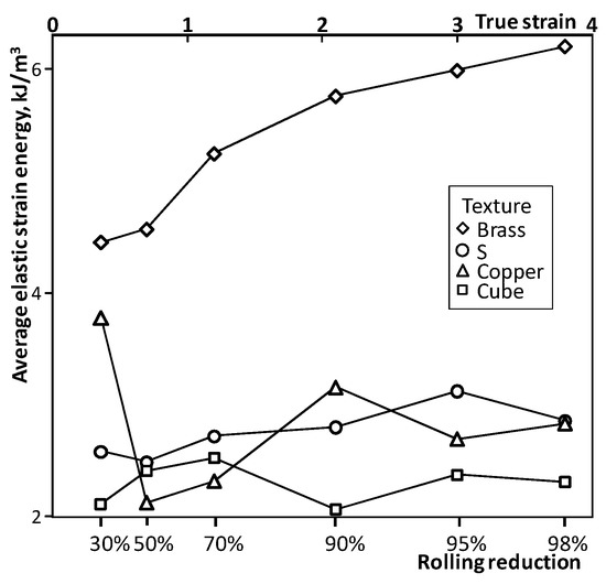 where G = 26 GPa is valid for aluminum. The orientations based on the RS simulation are classified into the main rolling texture components of copper texture {90°, 30°, 45°}, brass texture {35°, 45°, 0°/90°} or S texture {55°, 35°, 65°} if their misorientations to the main components are not higher than 5°. The elastic energy of the orientations in the main texture components is calculated according to Equation (5). Figure 5 shows the average elastic energy of orientations. The average elastic energy of cube orientation indicated in Figure 2e is also calculated in a similar manner. Notably, the orientations in different texture components indicate different levels of elastic energy under the same simulation conditions. Brass texture demonstrates much a higher elastic energy in comparison with those of copper, cube and S textures (Figure 5).
