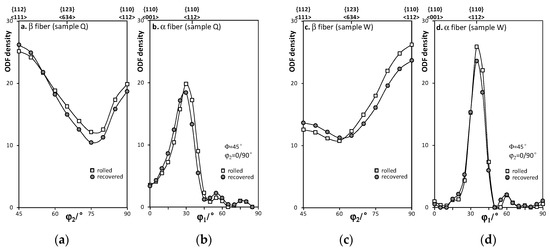 ODF fiber analysis of texture in 95% rolled and recovered aluminum sheets. (a) β-Fiber of sample Q; (b) α-fiber of sample Q; (c) β-fiber of sample W; (d) α-fiber of sample W.