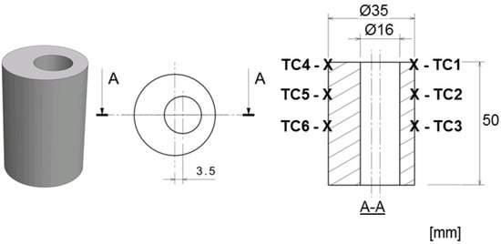 Figure 2. Three thermocouples are located on the thin-walled side (positions are indicated as TC1 to TC3) and three thermocouples on the thick-walled side (TC4 to TC6), respectively. The prepared specimens were placed in a thermobox together with the tools as shown in