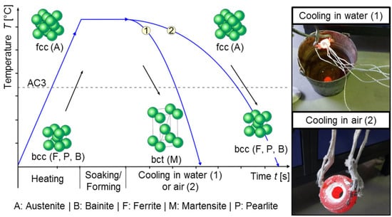 . In the next step, the specimen were removed from the thermobox and either quenched in cold water or cooled down to room temperature in still air. During the entire process chain, the temperature was measured via the thermocouples of type K (NiCr-Ni, manufacturer Günther GmbH). The bare thermocouple wires with a diameter of