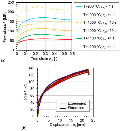 (a) Determined flow curves for hot forming applications from servohydraulic forming simulator Gleeble 3800-GTC and (b) comparison of force-displacement-curves from experiments and simulations.