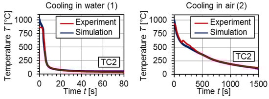 Appendix A. Since the modeling of the correct temperature profile is particularly important for the simulation of the phase transformations and finally the residual stresses, heat transfer coefficients (HTC) were also optimized. The HTC between steel and the cooling media air or water were determined in iterative numerical optimizations to accurately represent the cooling of the specimen in the simulation. Thus, they can be regarded as empirically fitted for the experiment under consideration. Initial values for temperature-dependent HTC for air and water were calculated based on literature data [