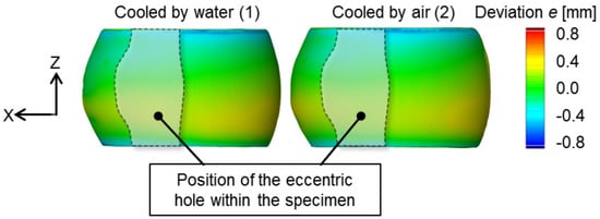 Figure 4) have been observed in the steel alloys. During rapid cooling in water, a diffusionless transformation occurs, where austenite is transformed into the martensitic body-centered tetragonal (bct) lattice structure. When cooled by air, a body-centered cubic (bcc) lattice with a ferritic, pearlitic, or bainitic microstructure depending on the cooling path is formed, as a consequence of a diffusion-controlled transformation. As a result, various residual stress conditions and distortions are expected in the differently cooled specimen.