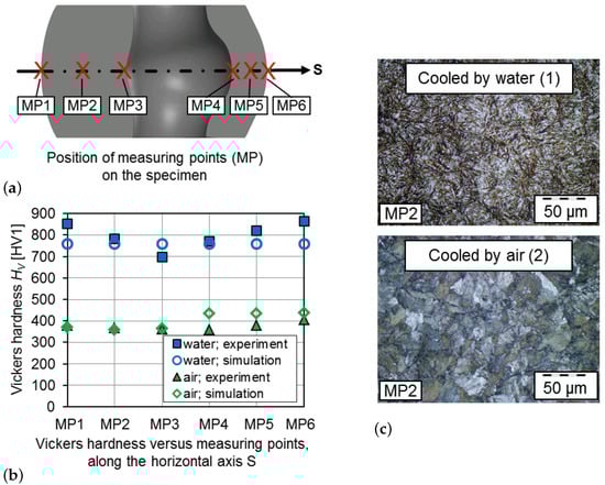 (a) Positions of the measuring points (MP1 to MP6) along the horizontal axis on the differently treated specimen, (b) results of Vickers hardness and (c) resulting microstructure after thermo-mechanical processing at MP2.