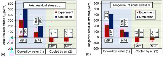 Arising residual stresses in (a) axial and (b) tangential direction on the surface of differently treated specimen at MP1 (thick-walled side) and MP6 (thin-walled side).