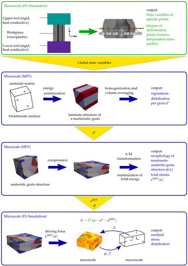 24], the multiscale approach is extended to further phases, e.g., bainite, pearlite, and steel types, e.g., low alloy ones. All the previously mentioned works use the FE Method for the numerical simulation. A further technique for the description of the physical aspects is the Multi-Phase-Field (MPF) model, which is introduced in [