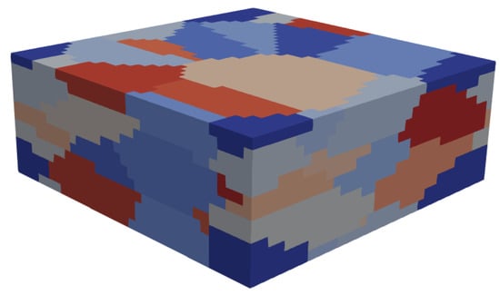 Reconstruction of the periodic mesoscopic grain structure containing 21 martensitic grains and 3 austenitic grains: FE model with 15,925 cubic elements with 136,107 nodes.