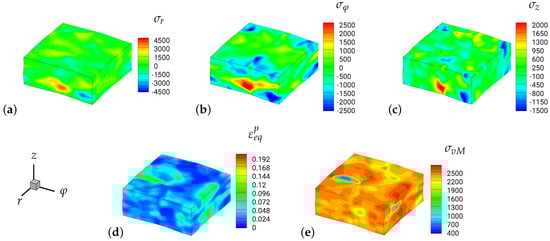 (a) Radial stresses in MPa, (b) tangential stresses in MPa, (c) axial stresses in MPa, (d) equivalent plastic strains and (e) von Mises stress in MPa.