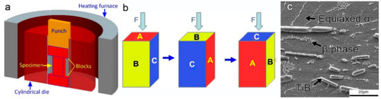 (a,b) Schematic illustration of multi-directional forging process; (c) SEM micrograph of the 7.5 vol.% TiBw/near α-Ti composite.