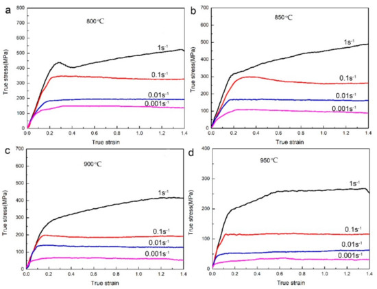 The flow stress-strain curves of the 7.5 vol.% TiBw/near α-Ti composite obtained at different deformation conditions are shown in Figure 2. The flow stress decreases significantly with decreasing strain rate and increasing deformation temperature. The flow stress reduction is due to dynamic softening, including dynamic recovery (DRV) and dynamic recrystallization (DRX), both of which are more active at high temperatures and low strain rates. The shapes of true stress-strain curves are related to the relationship between work hardening and dynamic softening [22]. In the initial stage, the flow stress increases rapidly as the strain increases due to work hardening [23,24]. After reaching the maximum value, the flow stresses change moderately in the strain rate range of 0.001–0.1 s−1 because dynamic softening and work hardening reach an equilibrium. At a higher strain rate of 1 s−1, the flow stress continuously increases until a peak value is reached, indicating work hardening is dominant against dynamic softening. The work hardening generally appears as a result of multiplication and pile-up of dislocations. These dislocations do not have sufficient time to slide or climb at high strain rates. Furthermore, at 800 °C/1 s−1 (Figure 2a), the flow stress first increases to a peak value and then decreases until the true strain reaches 0.4 and then increases again. This result could be attributed to severe stress concentration around TiBw, synergic effect of shear band propagation and adiabatic heating [25]. Nevertheless, thermomechanical deformation mechanisms cannot be simply determined relying on the shapes of the flow stress-strain curves, because different microstructural mechanisms may result in several similar flow behaviors during hot deformation. Therefore, the microstructure evolution was further analyzed in the subsequent sections and a more accurate thermal deformation mechanism of the composite will be determined.
