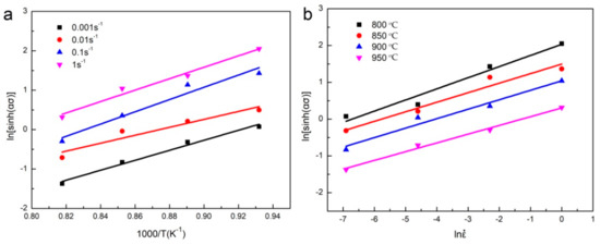 Plots of ln[sinh(ασ)] vs. T−1 and ln[sinh(ασ)] vs. are shown in Figure 3. From Figure 3, we calculated n = 3.81 and n3 = 12,940.73. Combining above results, the activation energy (Q) of the composite is estimated to be 410.40 kJ/mol, which is much lower than that of as-forged (TiB + La2O3)/Ti composites (753 kJ/mol) [12] and as-sintered TiBw/Ti60 composite (681.15 kJ/mol) [22], respectively. The decrease of the activation energy is related to the breaking of TiBw reinforcement during multi-directional forging and the fine matrix microstructure which significantly improves the hot deformation ability of the composite.