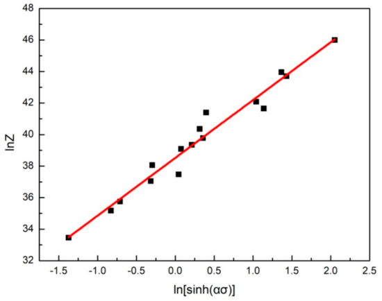 Substituting the thermal activation energy Q into Equation (5), we can calculate the corresponding value of lnZ, and plot the linear fitting relationship between lnZ and ln[sinh(ασ)], as shown in Figure 4. The slope in Figure 4 represents the stress index n and the intercept is lnA. The correlation coefficient R2 for the constitutive model is 0.981, indicating that the established constitutive equation is suitable for the 7.5 vol.% TiBw/near α-Ti composite. Finally, the constitutive equation can be presented as: