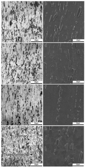 Microstructure of 7.5 vol.% TiBw/near α-Ti composite deformed at various temperatures: (a,b) 800 °C, (c,d) 850 °C, (e,f) 900 °C, (g,h) 950 °C. The strain rate was 0.01 s−1 in all of the cases. CD is the compression direction, and RD is perpendicular to CD on the observation surface.